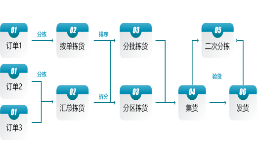 汇总拣货:多张订单汇总数量后统一拣货,然后按订单分拣;